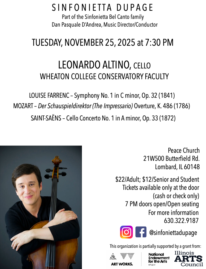 Sinfonietta DuPage (SDP) is a volunteer/community orchestra which rehearses weekly and performs concerts of orchestral pieces and concerti with noted soloists, including those from the Chicago Symphony Orchestra and the Lyric Opera Orchestra.